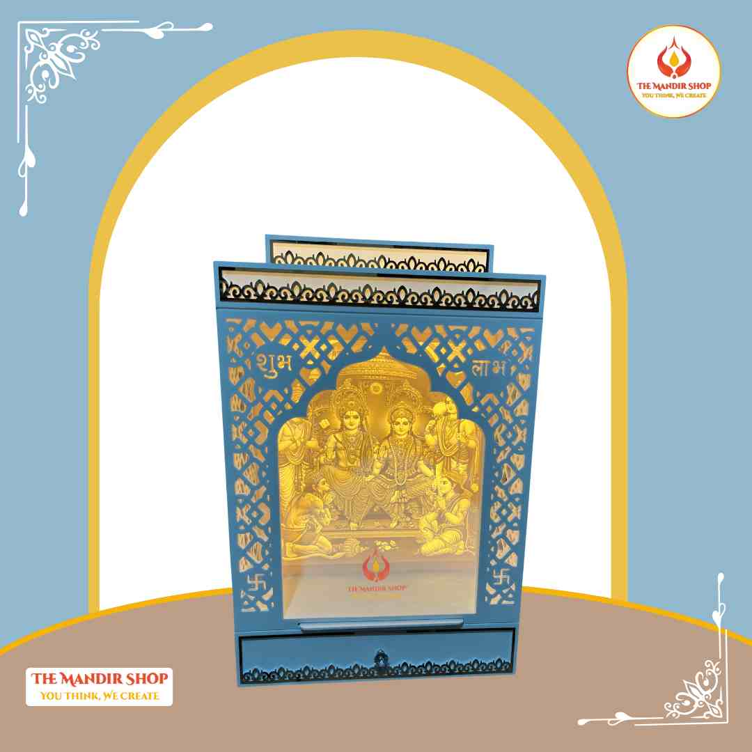 A compact Corian Mandir designed for modern homes, this Small Ram Darbar Corian Mandir features an elegant laser-cut frame and a divine Ram Darbar backdrop. Crafted from premium Corian solid surface, it is durable, easy to maintain, and ideal for apartments, wall units, or limited pooja spaces. Subtle backlighting enhances the sacred artwork, creating a calm and focused prayer environment without occupying unnecessary space.